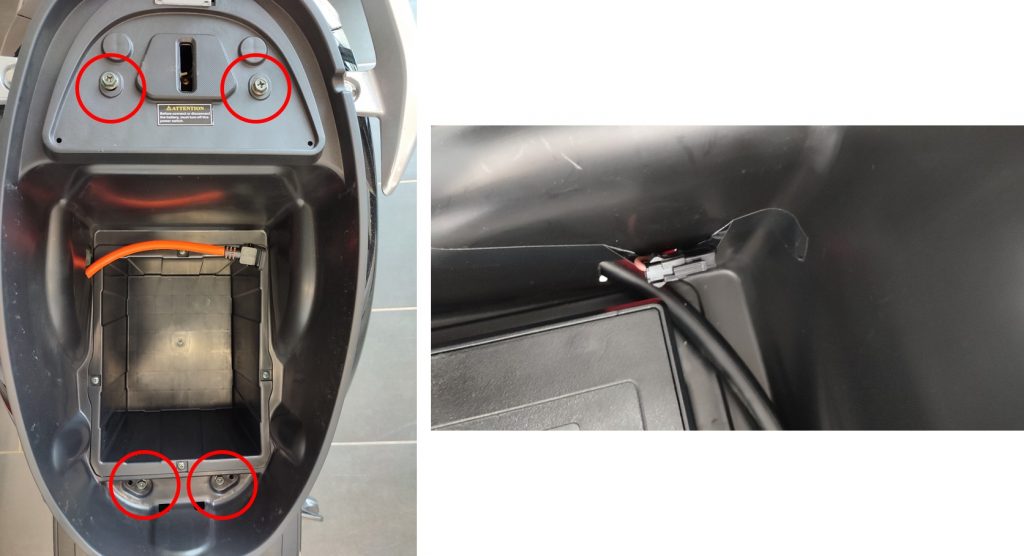 Unter der Sitzbank befindet sich eine runde Kunststoffabdeckung. Diese kann entfernt werden. Darunter befindet sich das Kabel, welches zusammengesteckt werden kann.
