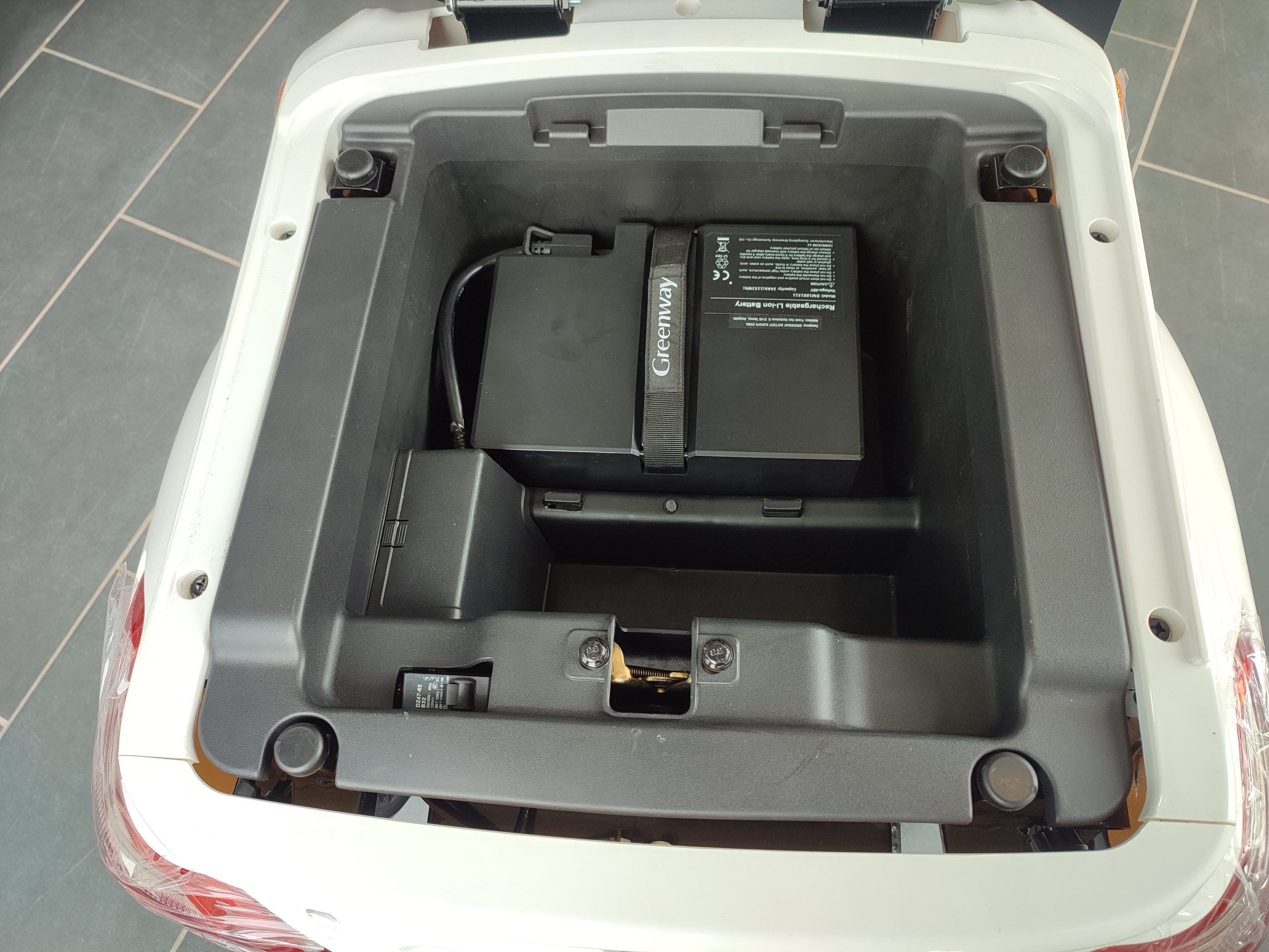 - 48V 24Ah (1,152 kWh) Lithium-Ionen-Akku, entnehmbar, mindestens 800 Vollladezyklen, Batteriemangementsystem (BMS) mit Unterspannungsschutz und Überstromschutzeinrichtung, kein Platz für einen Zweitakku