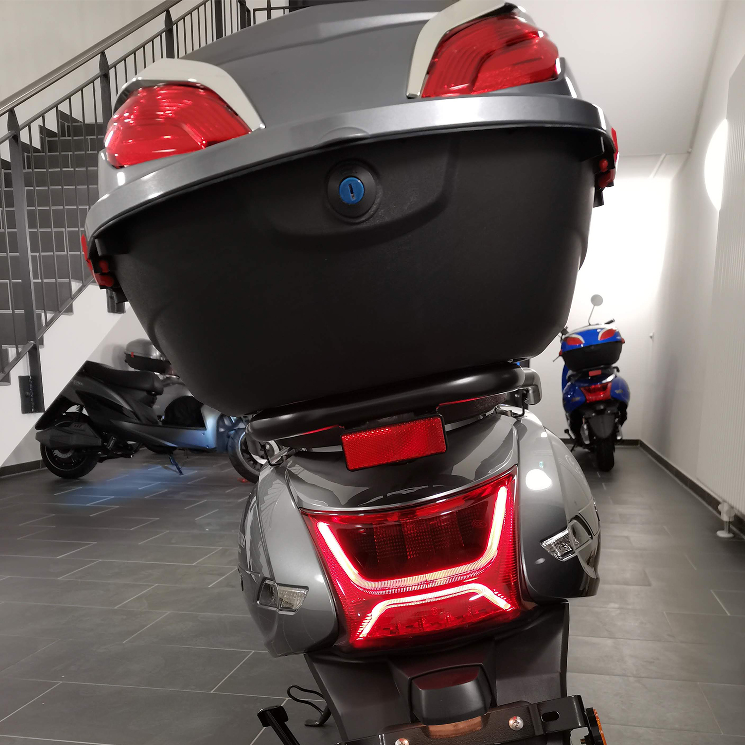 - Keyles Go System (Der Roller kann mit der mitgelieferten Fernbedienung aktiviert werden und lässt sich dann ohne Schlüssel starten. Wer das System nicht nutzen möchte kann den Roller aber auch ganz normal mit dem Zündschlüssel starten)